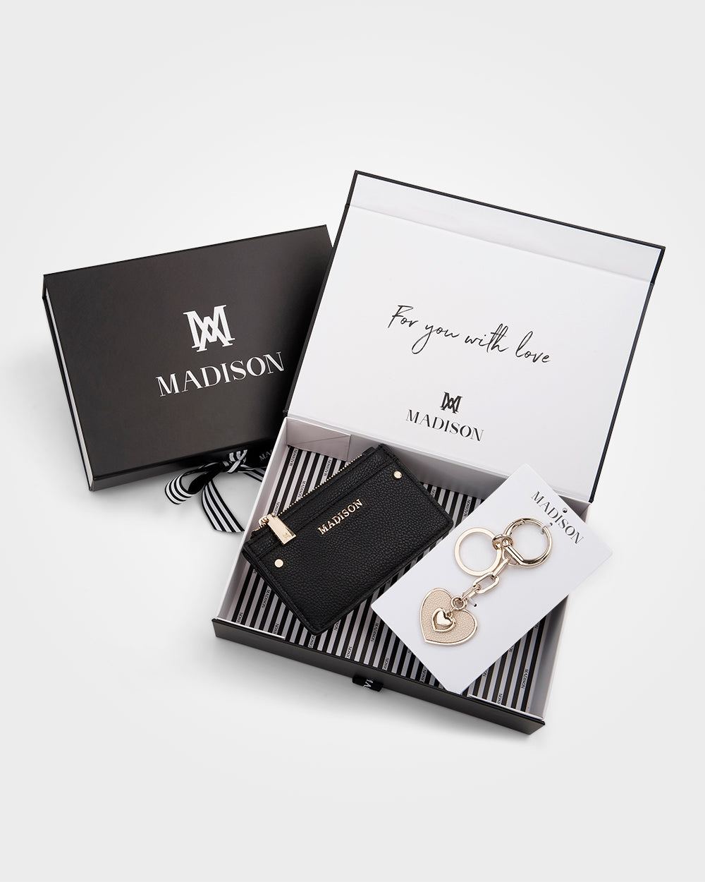 An ideal gift combining a cardholder wallet and our hearts keychain, all packaged in our deluxe Madison giftbox. Our Vanessa cardholder is an ideal accessory for anyone ready to downsize from a wallet to something smaller. Perfect to fit inside most small bags and not take up too much space, this small wallet holds essential cards and cash - ensuring you are never left stranded with no way to pay! The additional Keychain is a stylish way to keep keys close at hand.