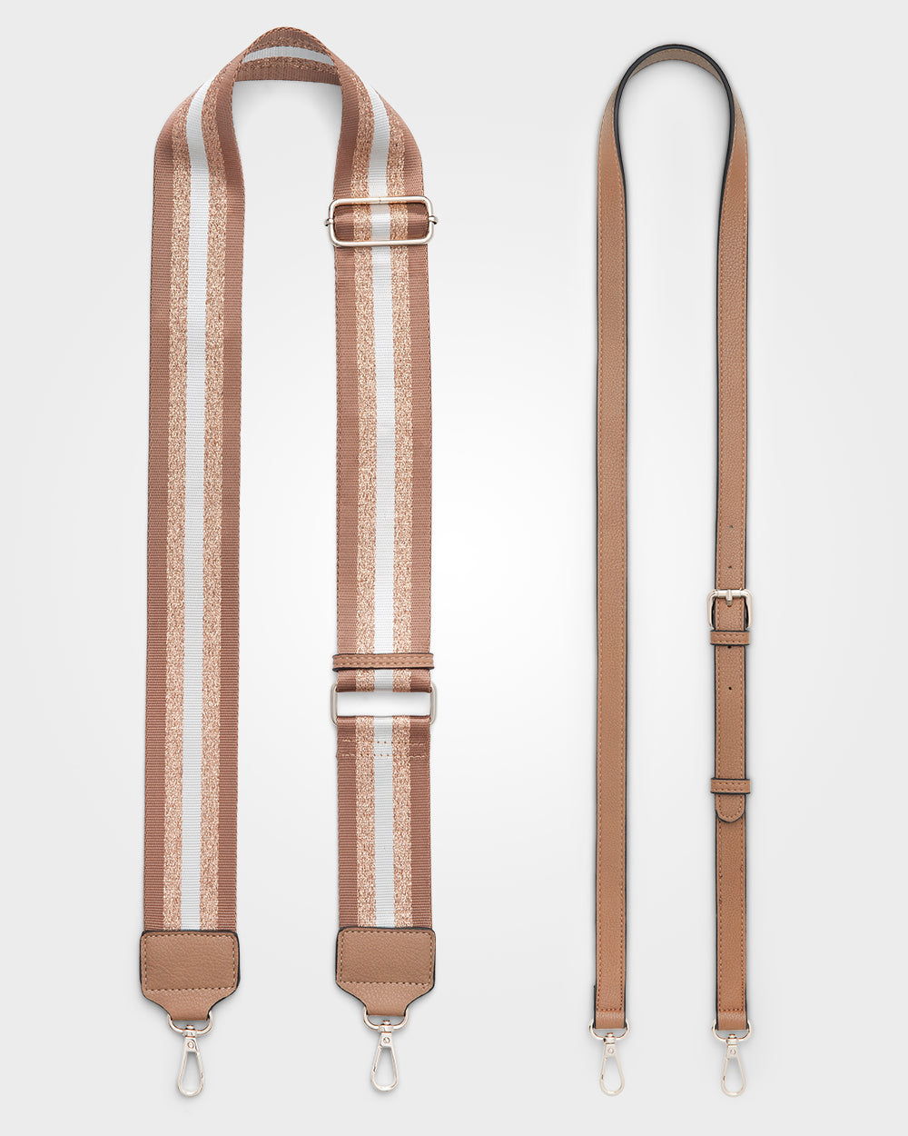 • 2 Strap Options, Detachable & Interchangeable between Metallic Stripe Patterned Webbing Strap or matching crossbody strap - both adjustable.