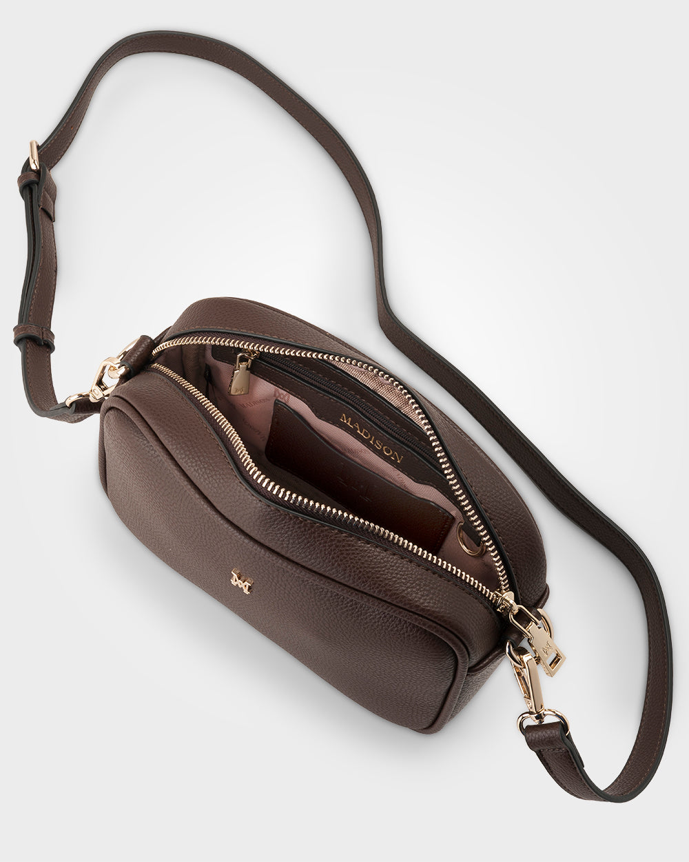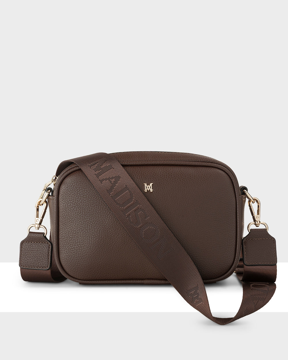 This Madison camera crossbody bag is our most loved style in a luscious Chocolate new colour. Monica + Monogram comes with a Madison webbing strap, as well as a matching crossbody strap - perfect for changing up your look and getting maximum versatility from your bag. Its soft shape and spacious interior will fit your everyday essentials, ideal for when you want to be hands free. A slip pocket on the back is perfect for quick access to your phone.